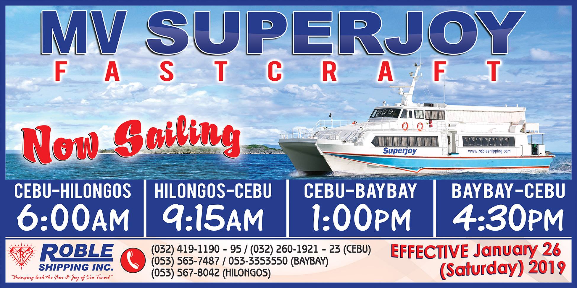 Cebu to Hilongos : 6:00AM Hilongos to Cebu : 9:15AM Accommodation Regular Fare Minor (-50%) Sr Citizen (-20%) Student (-15%) Round-Trip Discount (-20%) Tourist (aircon) P 650.00 P 464.50 P 552.50 P 325.00 P 520.00 Economy P 550.00 P 393.00 P 467.50 P 275.00 P 440.00 Cebu to Baybay : 1:00PM Baybay to Cebu : 4:30PM Accommodation Regular Fare Minor (-50%) Sr Citizen (-20%) Student (-15%) Round-Trip Discount (-20%) Tourist (aircon) P 680.00 P 485.75 P 578.00 P 340.00 P [...]